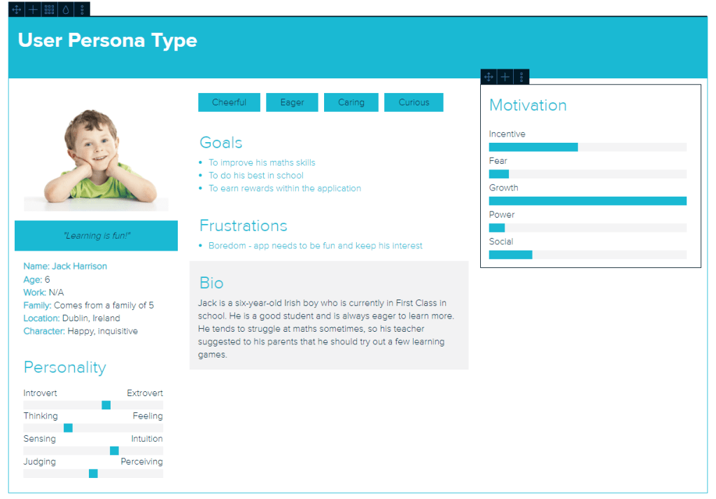 The child persona shows that the application must be engaging and challenging for children. How the application appears visually is also important as the child may become bored and lose interest. The child must be rewarded for completing tasks as it gives an incentive for the child to continue using the app.