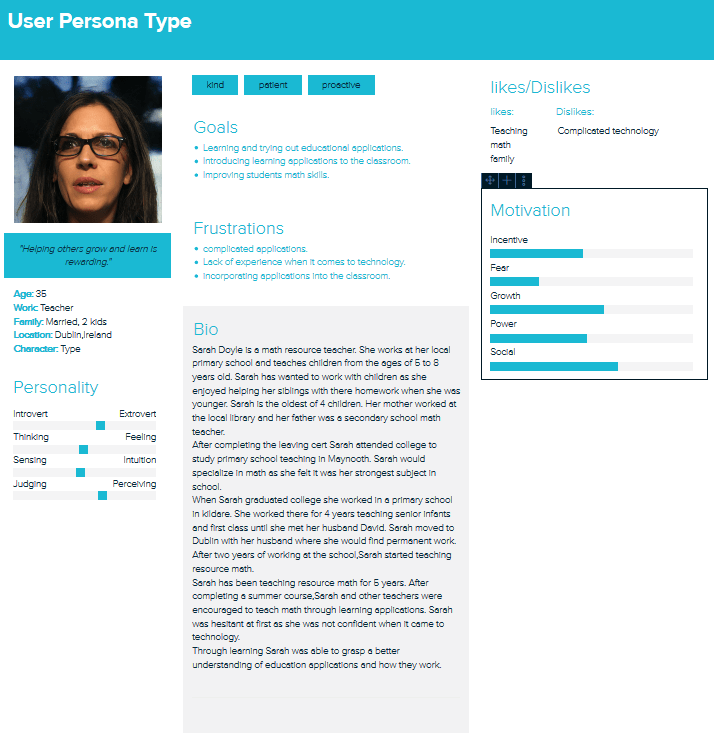 To help give us a better understanding of the user’s needs, a teacher persona and a child persona were created. A teacher would be a relevant user as they would assist and monitor the child while they use the application. Before the child would use the application, the teacher would test it themselves to see if it correlates with their learning plan.